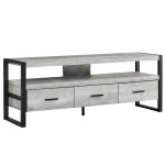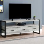 If you’re looking to embellish the look and feel of your living room, you’ve found the right TV stand. Its modern design is certain to break monotony and uniformity, and its careful craftsmanship will definitely be the highlight of your living room. This TV stand is perfect for those who want a piece that will be the focal point of their living space. This TV stand is expertly made from particle board, MDF, metal, and laminate. It also blends this overall gorgeous appearance, with practicality and functionality, and it has a hollow core. It has three drawers and a shelf, which are the perfect display space for book and DVD collections, your Xbox, or your magazines. With this TV stand in your living room, you’ll keep your media accessories organized, and turn the heads of your guests. As for measurements, they’re 21.75′ for height, 15.5′ for width, and 59′ for depth, and it weighs 77 pounds. You can match it with other decorations to get the ideal look.