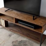 Craft the ideal blend of style, function, and design with this mid-century modern style TV stand. It is a classy piece, made of high quality maple and steel. Its chocolate color and finish are nothing to scoff at either. This TV stand an ultimate instrument to present a bit of freshness into your place. This TV stand also blends being overall stunning with being practical. Beyond just being perfect for your TV, there is no better place for your video collections, or video games, board games, electronics, or media accessories. As for measurements, they are 24″ for height, 60″ for width, and 16″ for depth, and it weighs 60 pounds. This TV stand would be ideal for your living room, for example. You can match it with other decorations to get an ideal look for your space.